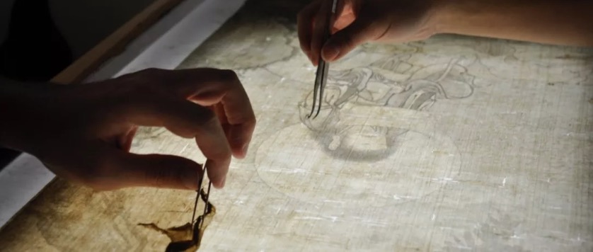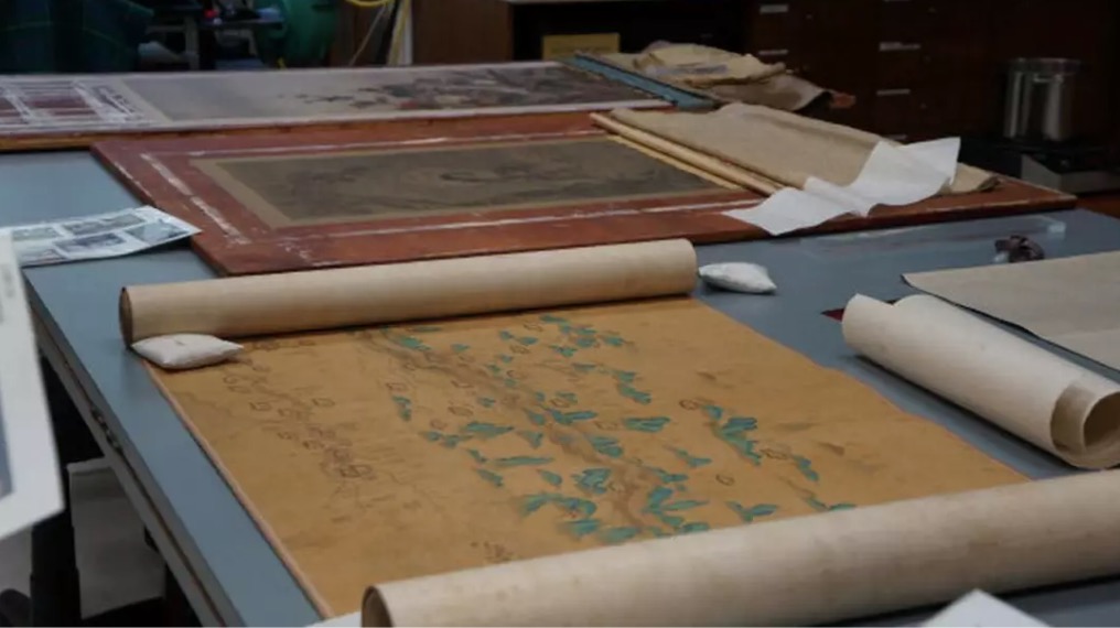 在弗瑞尔美术馆/赛克勒博物馆东亚绘画保护工作室中,一幅待修复的中国明代黄河地图,图片来源:mcclatchydc.com