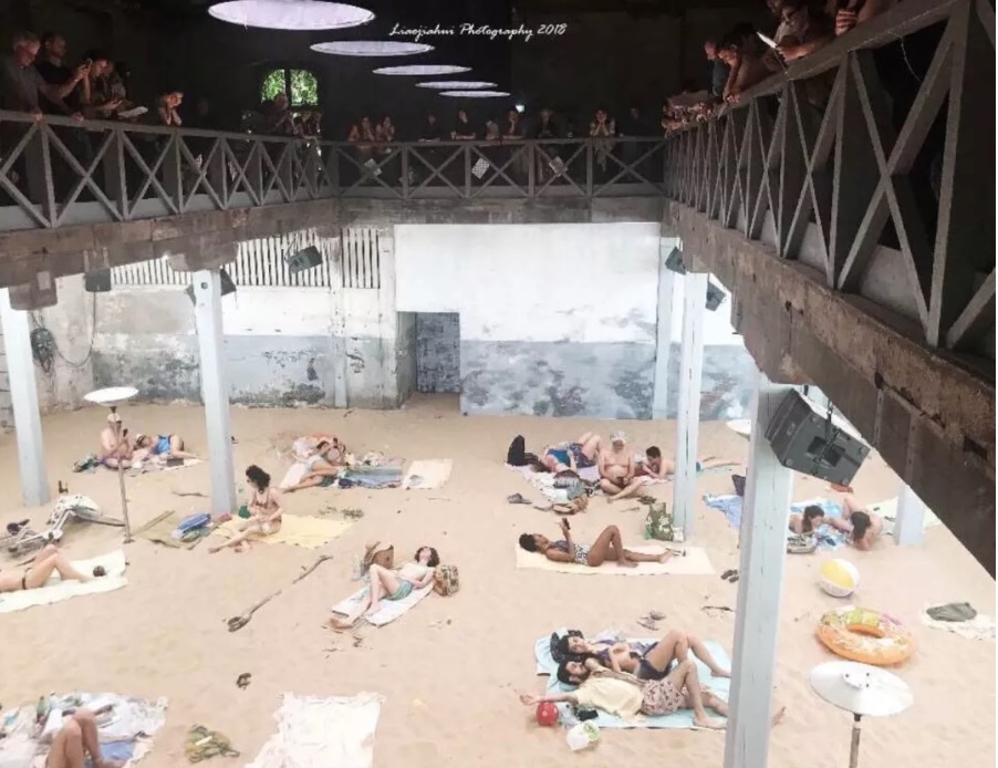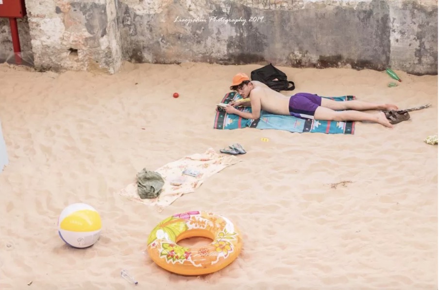 艺术家在馆内再造了一个海滩,温度、光照、环境和人物都被严格再现。访客站在二楼,以上帝视角俯视底楼的沙滩:黄澄澄的沙子、东倒西歪躺着的人们、奔跑呼叫的孩子、洒落的沙滩用具。。。。。。反正看着那个趴着玩手机入迷的少女,我觉得大概在上帝的眼中,之前去沙滩玩的我也是那个样子吧:身在沙滩,意识却在虚拟世界冲浪。演员很松弛与入戏,他们时而独唱关于自己的故事、想法,时而合唱。我暗暗地想:躺平还能中气十足地飙高音,真是厉害了。没准会破音?不过破音了,大家也认为是艺术设计吧。这就是艺术的好处,管你玩砸了,还是按剧本走,你都非、常、艺、术。