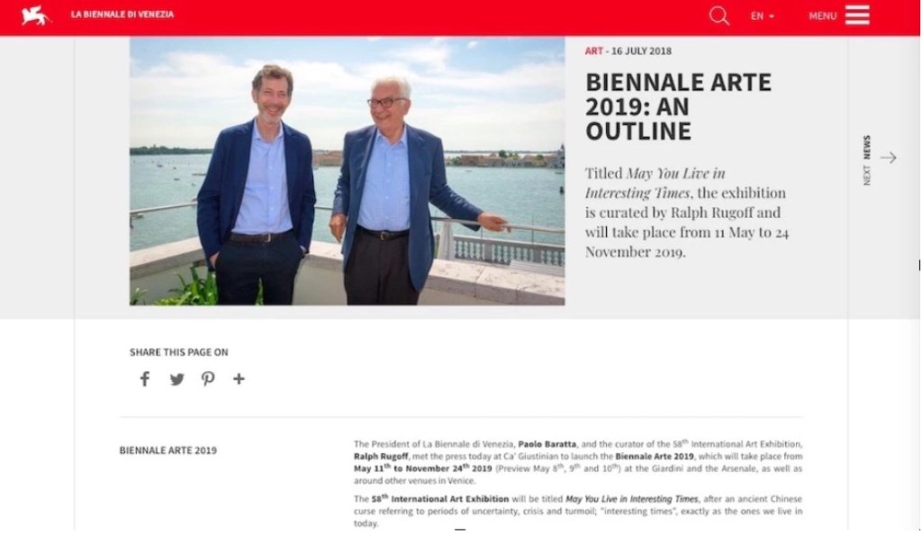 On July 18th, 2018, La Biennale di Venezia’s official site changed its theme description. They wrote: ”The 58th International Art Exhibition will be titled May You Live in Interesting Times, after an alleged ancient Chinese curse, a false belief that British MP Sir Austen Chamberlain had learned of from a British diplomat, and which refers to periods of uncertainty, crisis and turmoil; interesting time, is exactly the ones we live today.”
