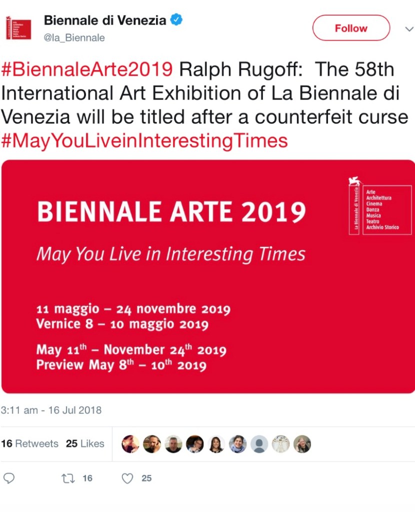 Then, on July 20th, 2018, La Biennale di Venezia’s official site changed the description again. They wrote: “The 58th International Art Exhibition, titled May You Live in Interesting Times, will take place from 11 May to 24 November 2019 (Pre-opening on 8, 9, 10 May). The title is a phrase of English invention that has long been mistakenly cited as an ancient Chinese curse that invokes periods of uncertainty, crisis and turmoil; interesting times, exactly as the ones we live in today.”