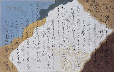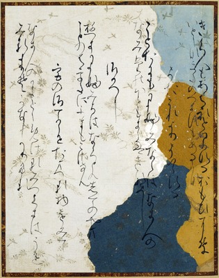 《石山切》(伊势集)也是很美的造纸,如果不是已经知道它们是12世纪的东西,我们很可能会认为是现代美术馆展出的现代日本人的作品因为它们是那么地富有现代风格。它是用了不同颜色的拼纸,用手撕开再按类似的边缘粘回去,然后再画小鸟和小草的图案(图9-7、图9-8)因为用的是银色,时间一长就会变蓝变黑,反而可能比原来更好看。这些书法具有不可思议的美感,而且工序繁复,好几个过程都要重叠在一起。日本人把书法跟贵族的装饰艺术结合在一起,都是纯手工做的。可是,这种美感之后就再也没有延续了。