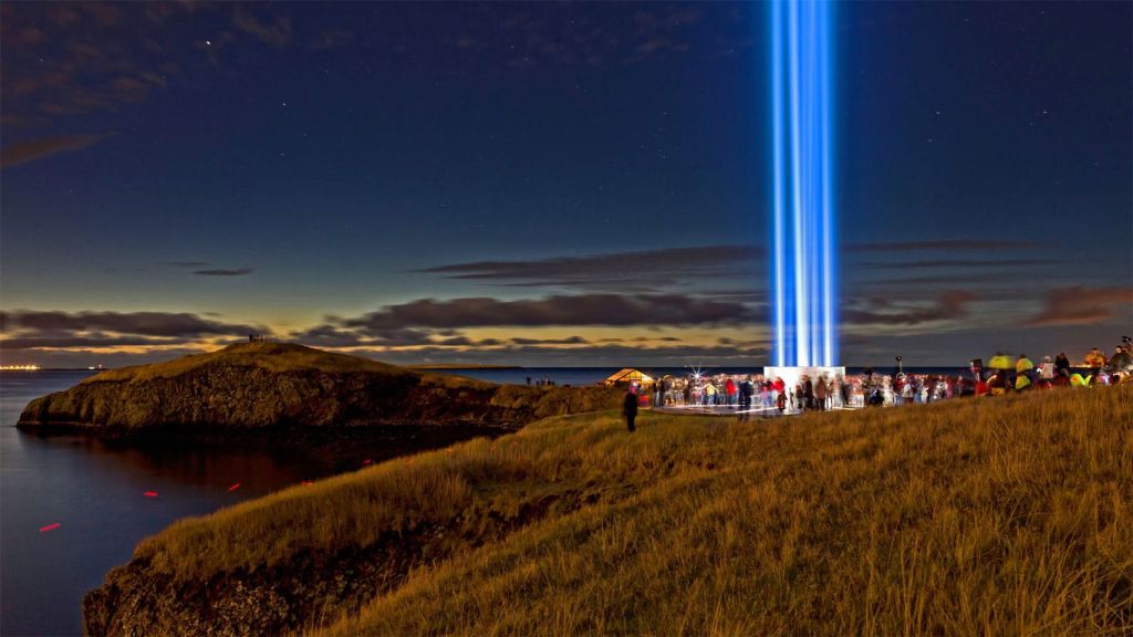 约翰·列侬的遗孀小野洋子(1933年生)是倡导全球和平以及环保的活动家,她于2007年在冰岛建造名为“梦想和平塔”的巨大灯塔(图7-12),以更积极的方式纪念曾与自己共同奋斗的丈夫,还有他们共同的信念。灯塔由光束组成,其中六道由棱镜反射,九道直接往上射,形成照耀天际的一根光柱,基座是石制许愿池,以二十四种语言刻着“梦想和平”(ImaginePeace灯光所需的75千瓦电力由冰岛特有的生态热能提供。这座倡导和平的灯塔每年特定时间点亮,届时虔心许愿者会聚集在此。眼看这座孤独但有力的灯塔高耸天际,伴随着大气条件不停波动,令聚集者内心激荡,共同祈愿和平的未来。