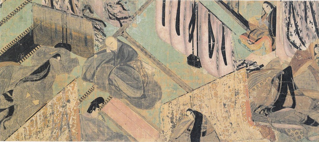 在这一幅画面里,我们看不到任何个性或表情,所有脸部描写都是采用著名的“引目钩鼻”法,只画出五官,没有个性。观者必须通过文字解说来了解故事内容,并借助人物的位置和姿态来辨认角色。再者,画面上表现的是剧情动作前之张力,而非动作本身。画面中各种角度的情景都能让观者看到的技巧,叫作“吹拔屋台”(ふきぬきやたい),字面上理解就是指屋顶被吹走后,观者很容易以俯视的角度看到房中人的行动和屋中的设置,现在留存的《源氏物语绘卷》几乎都是用这种技法发挥完成构图。画中的地板可看出是榻榻米,从而判断两间房间的间隔是推拉门。画面中还可以看到可移动的垂帘,这种垂帘不仅样式精美,而且可以将房中空间随意分割,不用时还可以向上卷起。