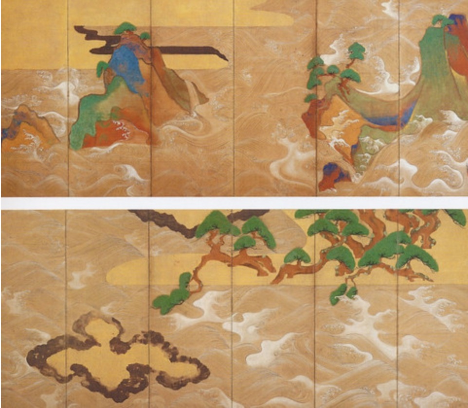 长久以来,浪潮、岩块和松树一直是屏风画处理精湛的常见题材,室町时代最受欢迎的图景结构是前景的岩石上成行排列的松树,画面上方2/3的空间都是流水波浪,其间散置整块凸出的岩石。在此,宗达以三群岩岛、三座沙洲布局于两屏风壁上,重新探索传统题材的表现潜能,使平淡无奇的平安母题再度掀起戏剧性的活力和高潮,且每一个主题元素均采用不同角度加以捕捉。右面屏风最巨大的岩壁堂皇地自右方进入画面,显示鸟瞰视点;接着,第二、三组岩壁依序变小,视点也随之改变,第二组转变成正面角度呈现。左方屏风有三块河岸,最大的一块饰以平涂金色底临空而下,两株松树自两旁伸展,增添画面的视觉趣味,河岸接着向右方屏风延伸成云彩造型。还有,上方及下方各有一块覆盖灌木的沙岛,以金银、墨三色勾描,同样是鸟瞰视点,同时兼具浮云和沙岛的双重描绘作用(图中真正的云彩位于右面屏风上方)。画面的多重视点变化,使观者不断改变观赏位置,好比从右方进入画面后,先潜入水中仰望岩壁,再翻一个筋斗扶摇直上天际,凌空俯视沙岛,观者仿佛一只喜欢嬉戏的千鸟,时而隐身,时而暗示其存在。翻滚的波浪则以45度仰角呈现,一波接一波的漩涡和激荡飞扬的浪头与岩石、松树的静寂形成对比。