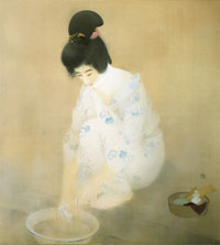 伊东深水(1898-1972)也是19世纪末20世纪初的画家。他的《热气》(图6-23)中,一位年轻的女子被朦胧的热气包围,正蹲在地上洗衣服,衣服和屁股的轮廓边缘都模糊了,这也是日本画最大的特征:没有过于苛刻、精准感情的外露,而是一直朦胧、模糊的温和。