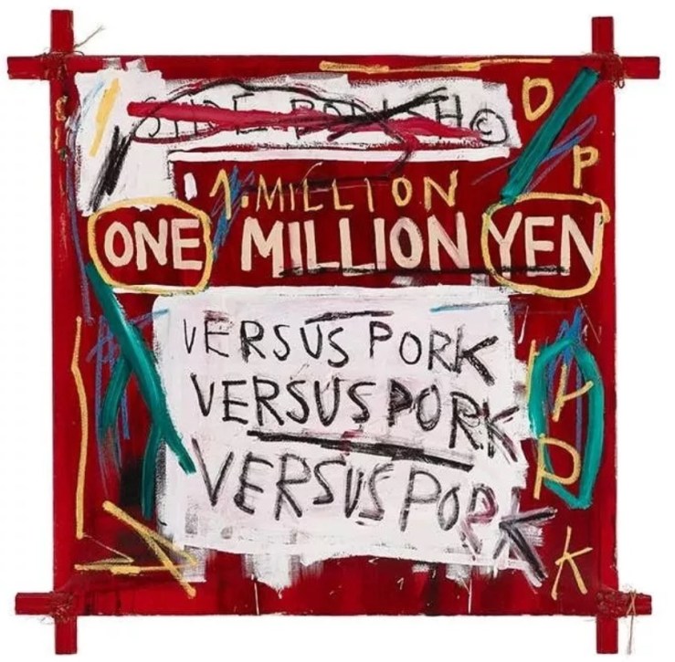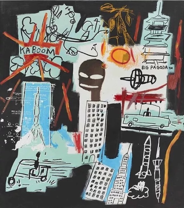 仔细观察巴斯奎特的作品,就会发现他并不会把重点只放在中心位置,整个画面的各个部分都很平衡。自由散布的图案和文字体现出巴斯奎特深受赛・托姆布雷和弗朗茨・克萊恩的影响,将街头涂鸦艺术行为带到了帆布之上。