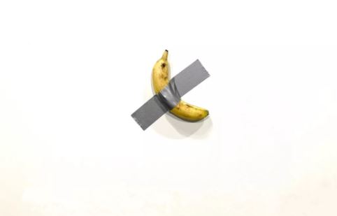 卡特兰以讽刺大众文化,反讽社会、权力和权威的超现实雕塑作品而闻名。本次的新作则用灰色的胶带将新鲜的香蕉贴在墙壁上,开幕首日该作品以12万美元(约84万人民币)到15万美元(约105万人民币)的价格售出3件。