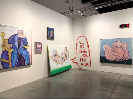 今年首次来到迈阿密海滩展会的北京魔金石空间带来了生于1983年的中国艺术家武晨的绘画作品。从亨利・马蒂斯的作品《红色的工作室》(1911)中汲取灵感,以“红色工作室里没有艺术家在场(The Red Studio Has No Artist)”为主题的展区,体现了对当前绘画语言的批判和反思。参与了本次展位策展,同时也是画廊研究主管的陈立说:“武晨用幽默诙谐的色彩与绘画语言,重新考察了以男性为主导的艺术史。”