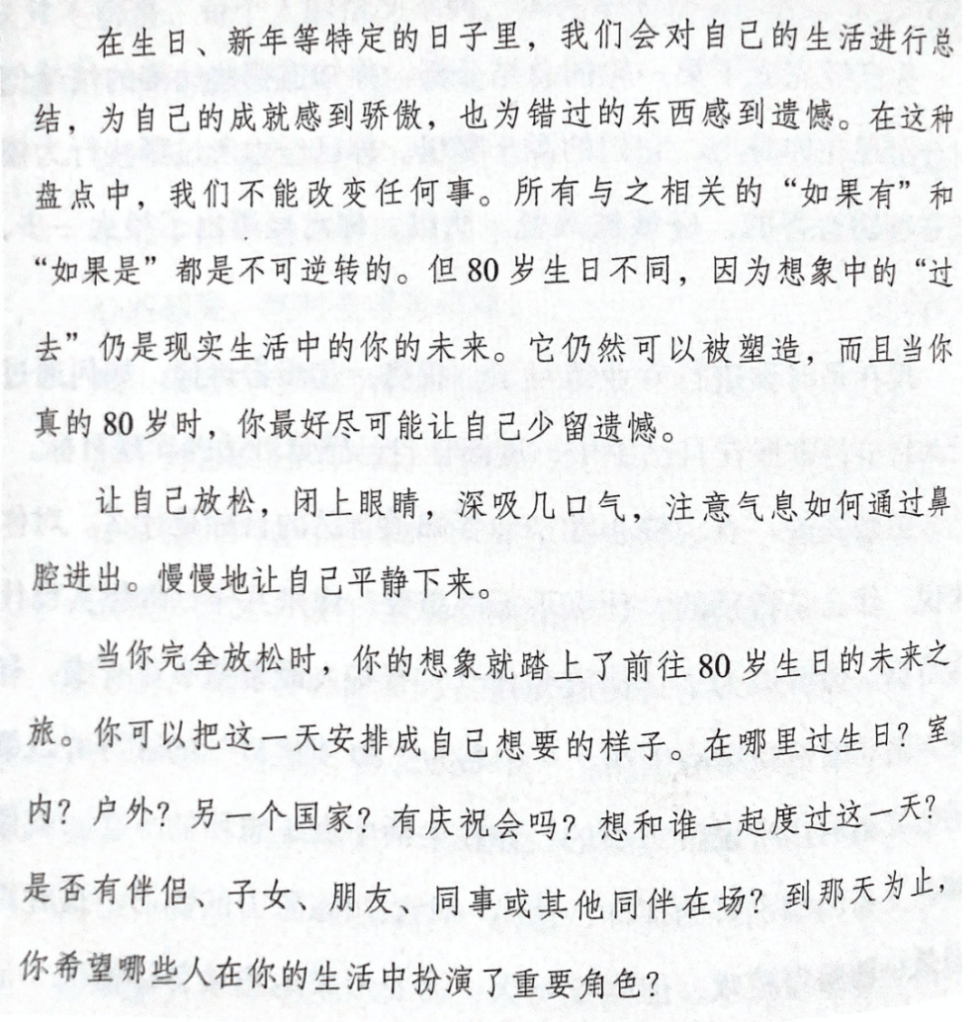到那天为止,我和我的伴侣虽然有过争执,但是都以发挥对方最大的潜力为目标,相互扶持到我的80岁。虽然已经垂垂老矣,但是彼此的爱意和信任依然深厚。我给予我后辈们最大限度的自由,自成年之后我不太插手他们的生活,正如他们不太插手我的生活一样,但是却保持着信任和随时互帮互助的准备。